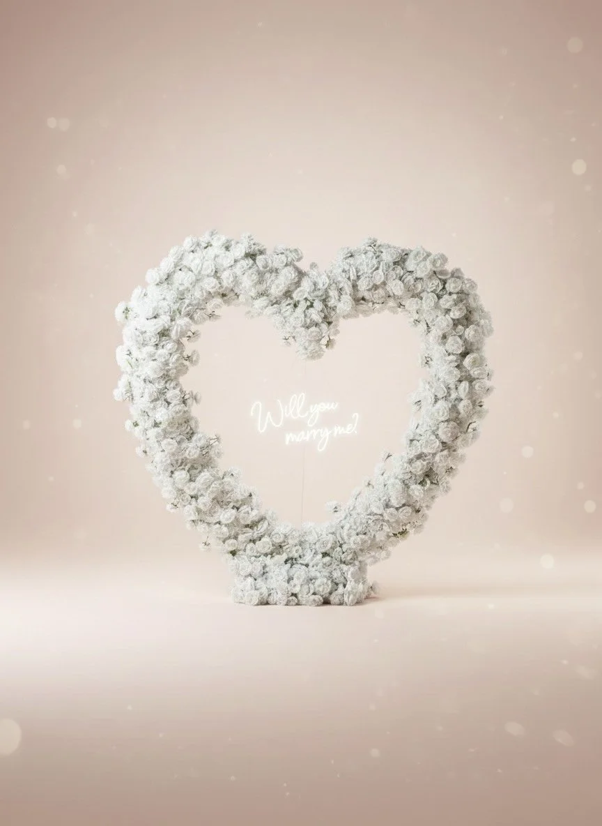 Step into a world of romance with a stunning floral heart in your choice of red, pink, or white. Your setup includes your preferred LED sign — “Will You Marry Me,” “¿Quieres ser mi novia?” or “You + Me.”